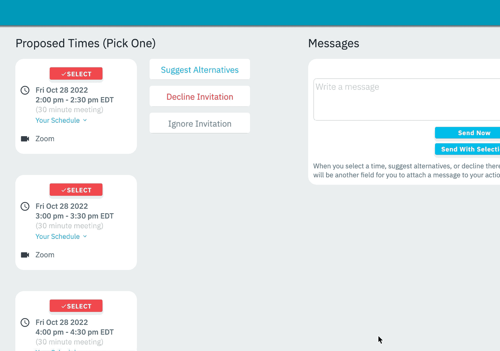 Feel free to send 1:1 invites to multiple people suggesting the same times. If something comes up on your schedule that conflicts with a time you proposed, if your recipient tries to select that time they will be informed it’s no longer available and advised to pick another time.