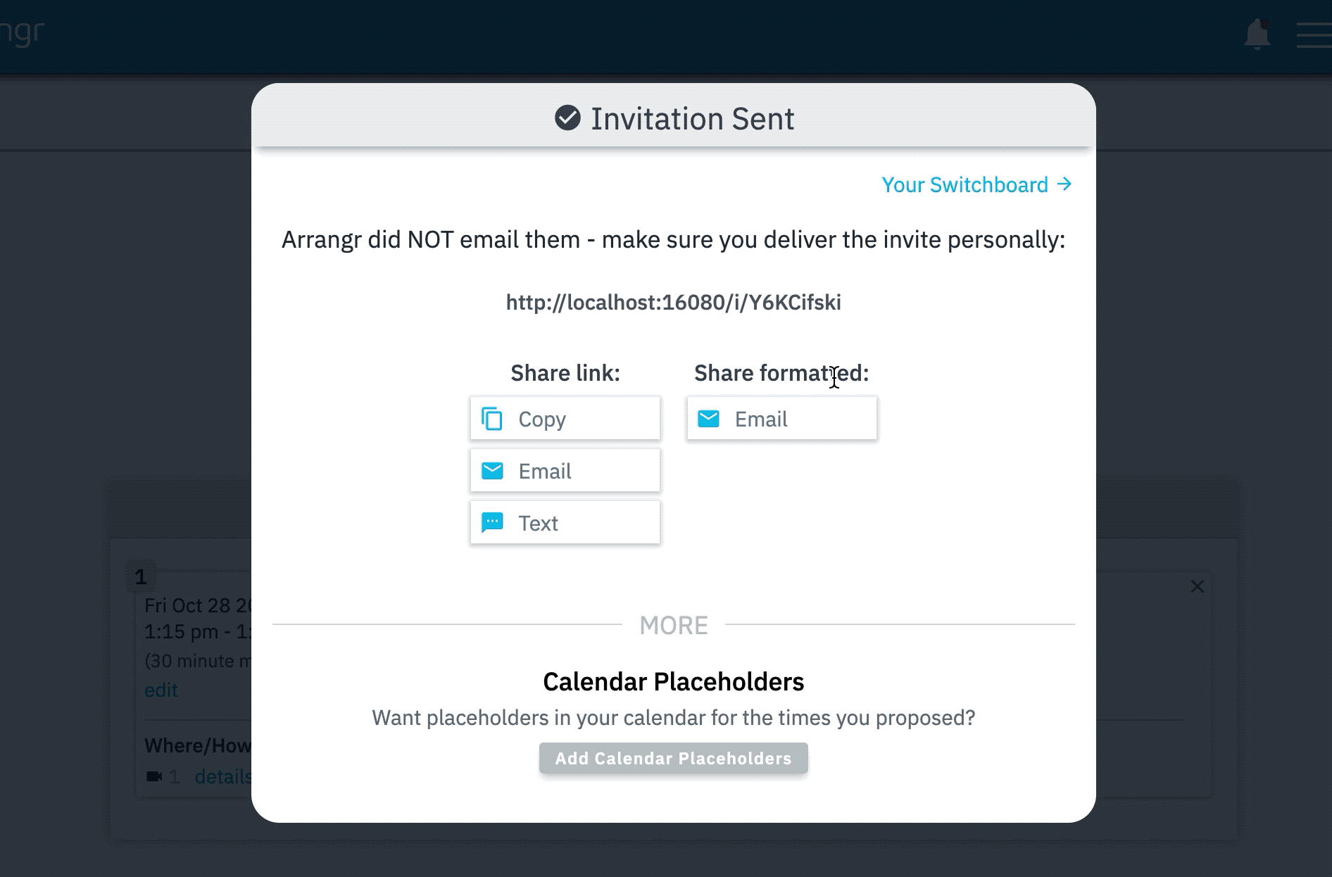 Arrangr can automatically email the invite to your recipient, but sometimes it's nice to hand-deliver it yourself. Arrangr lets you easily copy a nicely formatted version of the invite to your clipboard, which you can then simply paste into an email you're composing yourself. The recipient can then just click on a time right from your email to accept it.
