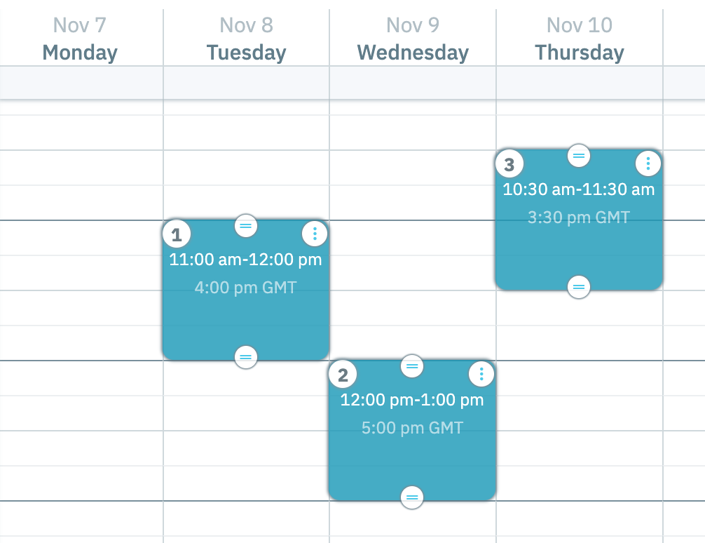 Not only can you suggest specific meeting times, but you can also highlight ranges of time when you're available, and let your recipient select a meeting time within that range. To do this, just select a block of time on the calendar that is longer than the meeting length is set to. For example, if the meeting length is set to 30 minutes and you select a 2 hour block on the calendar, it will be automatically interpreted as a 2 hour block when you're available for a 30-minute meeting (but you can always adjust this to propose it as a 2-hour meeting at that specific time instead).